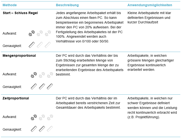 Wenn ein Arbeitspaket noch nicht gestartet wurde oder wenn alle Ergebnisse des Arbeitspakets bereits erarbeitet worden sind, ist der PC einfach zu ermitteln (0% bzw. 100%). Wenn ein Arbeitspaket an einem bestimmten Stichtag bereits begonnen aber noch nicht fertig gestellt wurde, muss der PC geschätzt werden. Für die Schätzung des PC können verschiedene Methoden angewendet werden: